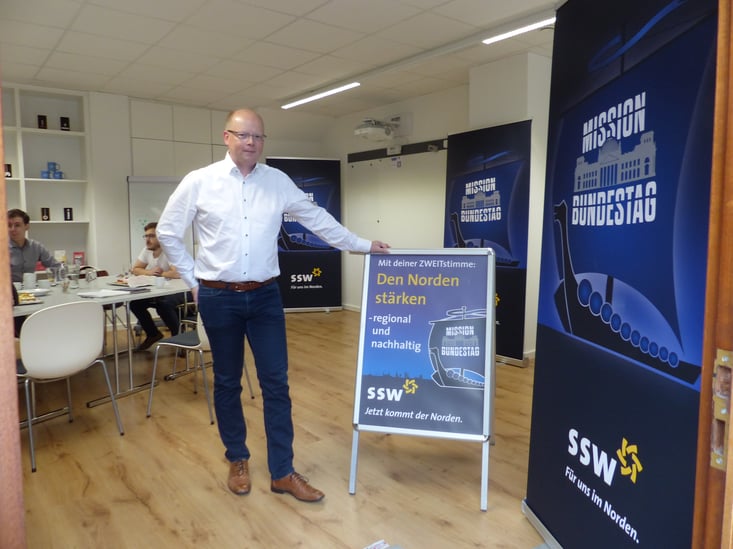 Als ich am 21. Juli vorbeikomme, trifft dort im selben Moment Herr Seidler zu einem Treffen mit seinem Wahlkampfteam ein. Plakate an der Fensterfront hatten mich schon informiert: Dieser Mann möchte nach Berlin. Zum ersten Mal seit 1961 tritt die Minderheitenpartei SSW in Schleswig-Holstein wieder zur Bundestagswahl an. Würden ca. 40.000 - 50.000 Landesbürger/innen Herrn Seidler mit ihrer Zweitstimme wählen, hätte der Politiker, der eine dänische Mutter und einen deutschen Vater hat, einen Sitz im 20. Deutschen Bundestag.