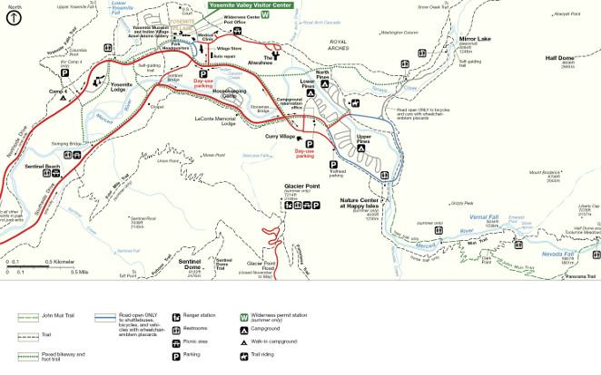 John Muirs Drängen hatte Erfolg: 1890 erklärte der US-Kongress die 3074 Quadratkilometer, die Teil der Sierra Nevada bilden, als besonderes Schutzgebiet. (Quelle) Damit ist Yosemite (nach Yellowstone) der zweitälteste Nationalpark der USA und von den insgesamt 59 geschützten US-Naturlandschaften der weitaus mit am meist besuchte: Jedes Jahr tummeln sich mehr als drei Millionen Besucher durch die Hauptverkehrsstraße (Highway 120), die Yosemite von Osten nach Westen durchzieht. Anlaufpunkt für die meisten Touristen ist dabei das Yosemite Valley.