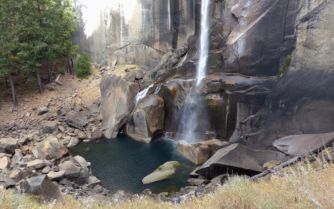 Und so auch für mich: Der Yarts-Bus brachte mich nach zwei Stunden Fahrt von Merced, wo ich übernachtet hatte, zum Visitor Centre im Yosemite Valley. Dort erkundete ich mich, wohin ich wandern könne, ich wollte einen tosenden Wasserfall sehen. Der Ranger im Centre empfahl mir den 'Vernal Fall' auf 1500 Meter Höhe, der trotz später Jahreszeit noch genügend Wasser führe. Nach einer guten Stunde Fußmarsch sollte ich dort ankommen. Ohne mir jegliche Gedanken zu machen, sah ich im Touristenbüro, wie Menschen irgendwelche Sachen in Plastikfässern verpackten.
